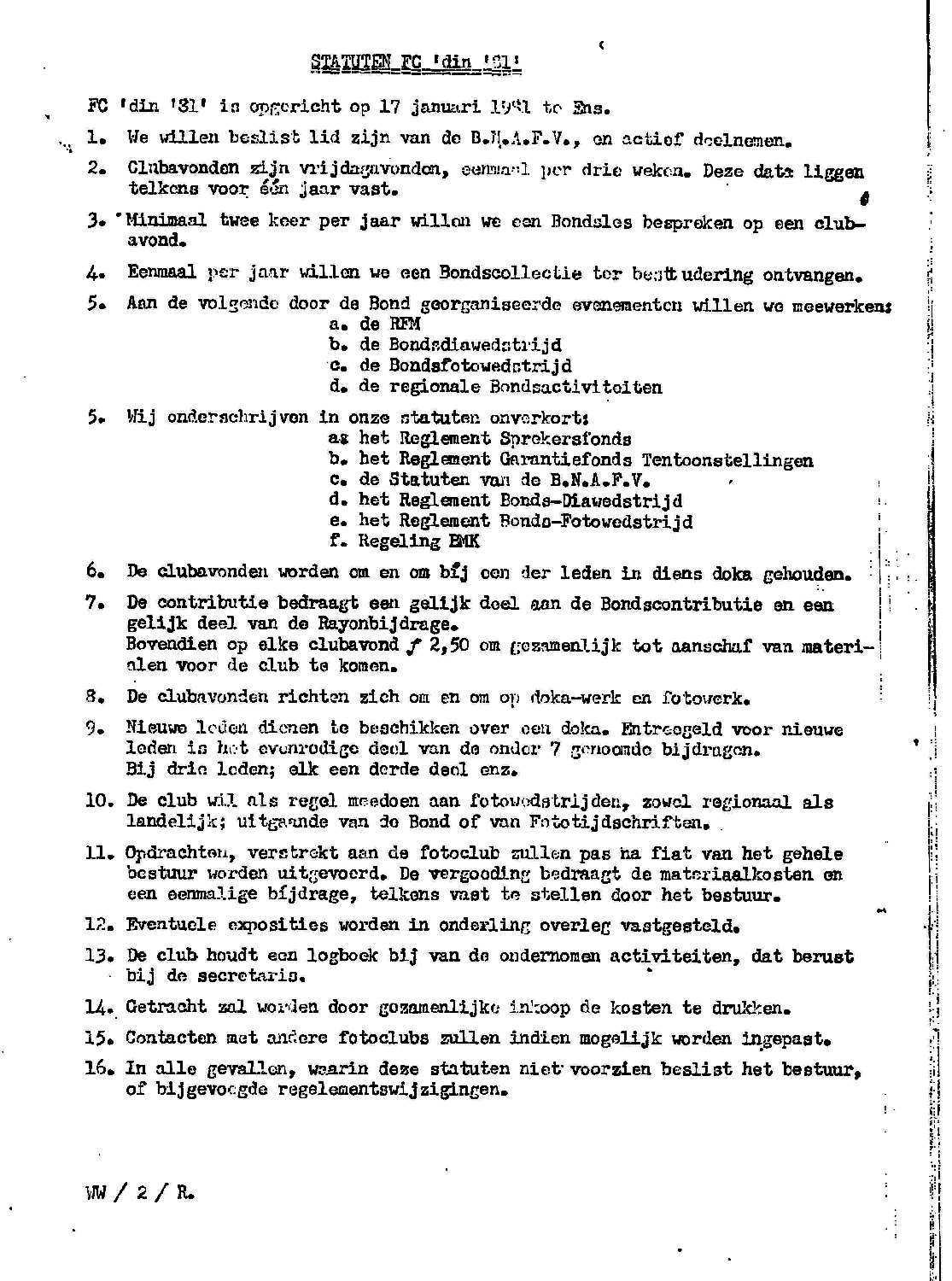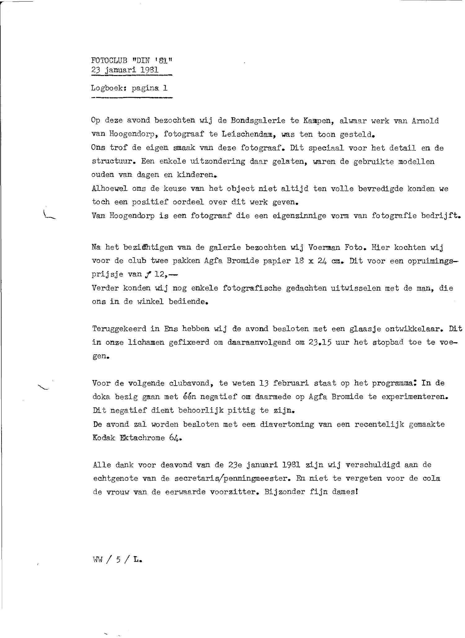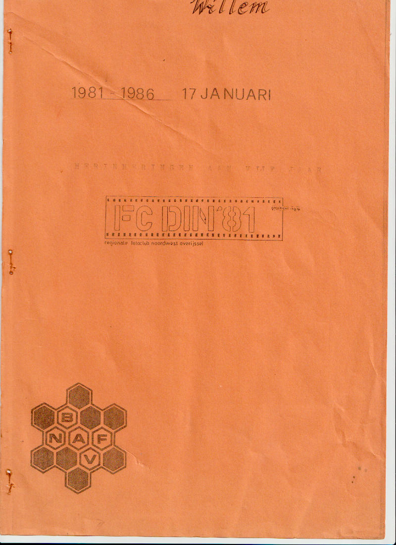 Hierbij wil ik echter vermelden dat ik tot op de dag van vandaag het zeer sterke vermoeden heb, dat de conceptie van deze boreling al (veel?) eerder had plaatsgevonden in Willems brein! De buitengewone soepelheid, waarmee hij het plan om een eigen fotoclub op te richten compleet met een (originele) naam, lanceerde, duidde al op een weloverwogen plan. Daarbij komt, dat nog dezelfde avond een concept statuten ter tafel lag. Ook is er een brief in mijn bezit, gericht aan de bond, waarin melding wordt gedaan van de oprichting van Din ’81. Deze brief is gedateerd op ……. 17 januari. Hij reagere maar op deze beschuldiging.
