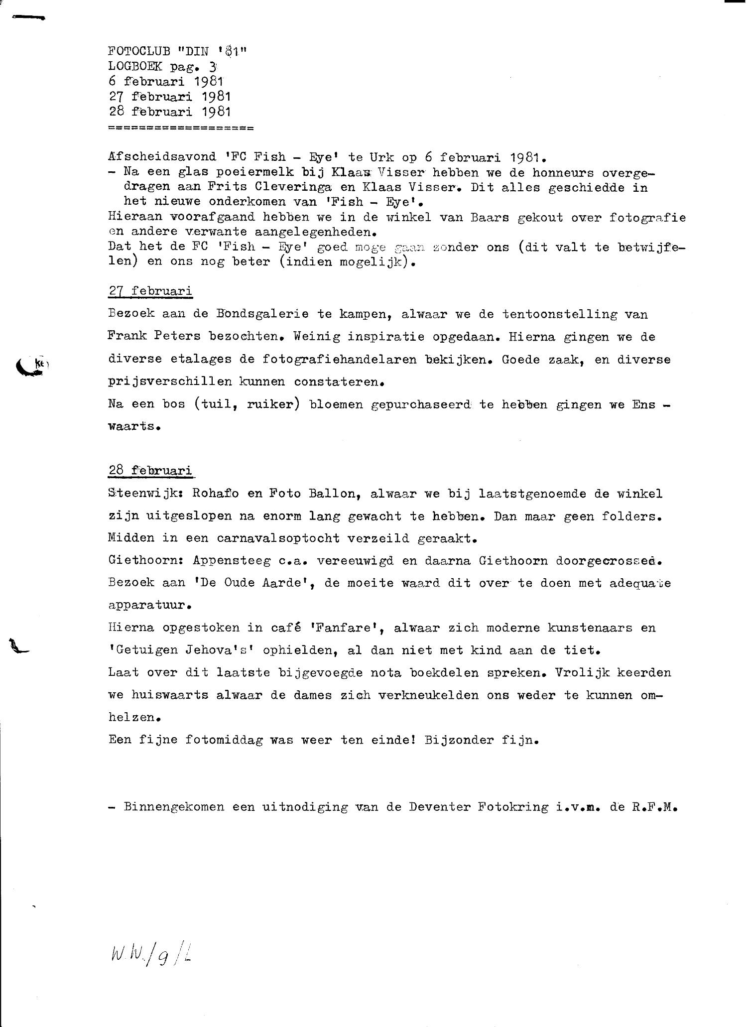 Als ik zo verder het logboek doorlees dan komen allerlei goede herinneringen boven: de bezoeken aan de Bondsgalerie in Kampen, gecombineerd met bezoeken aan diverse fotozaken. Fotoëxcursies naar Giethoorn (besloten met een gezellig samenzijn in café Fanfare), de Weerribben, Lelystad, Almere, Friesland en het N.S.-station te Zwolle.